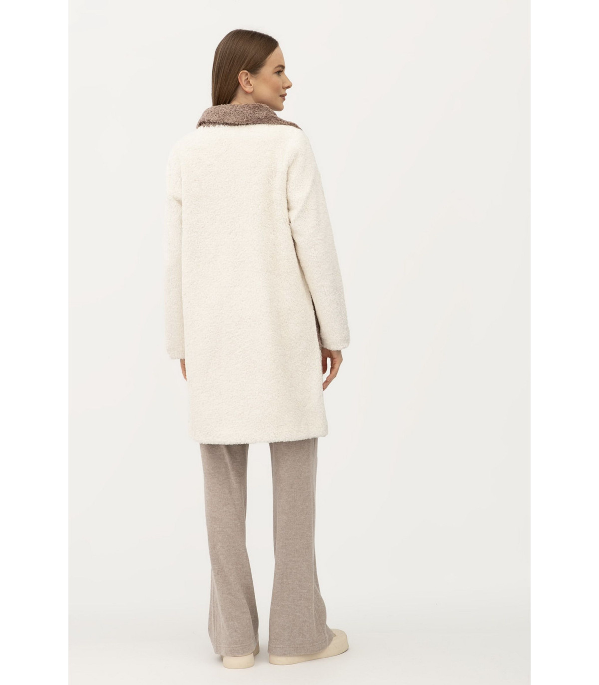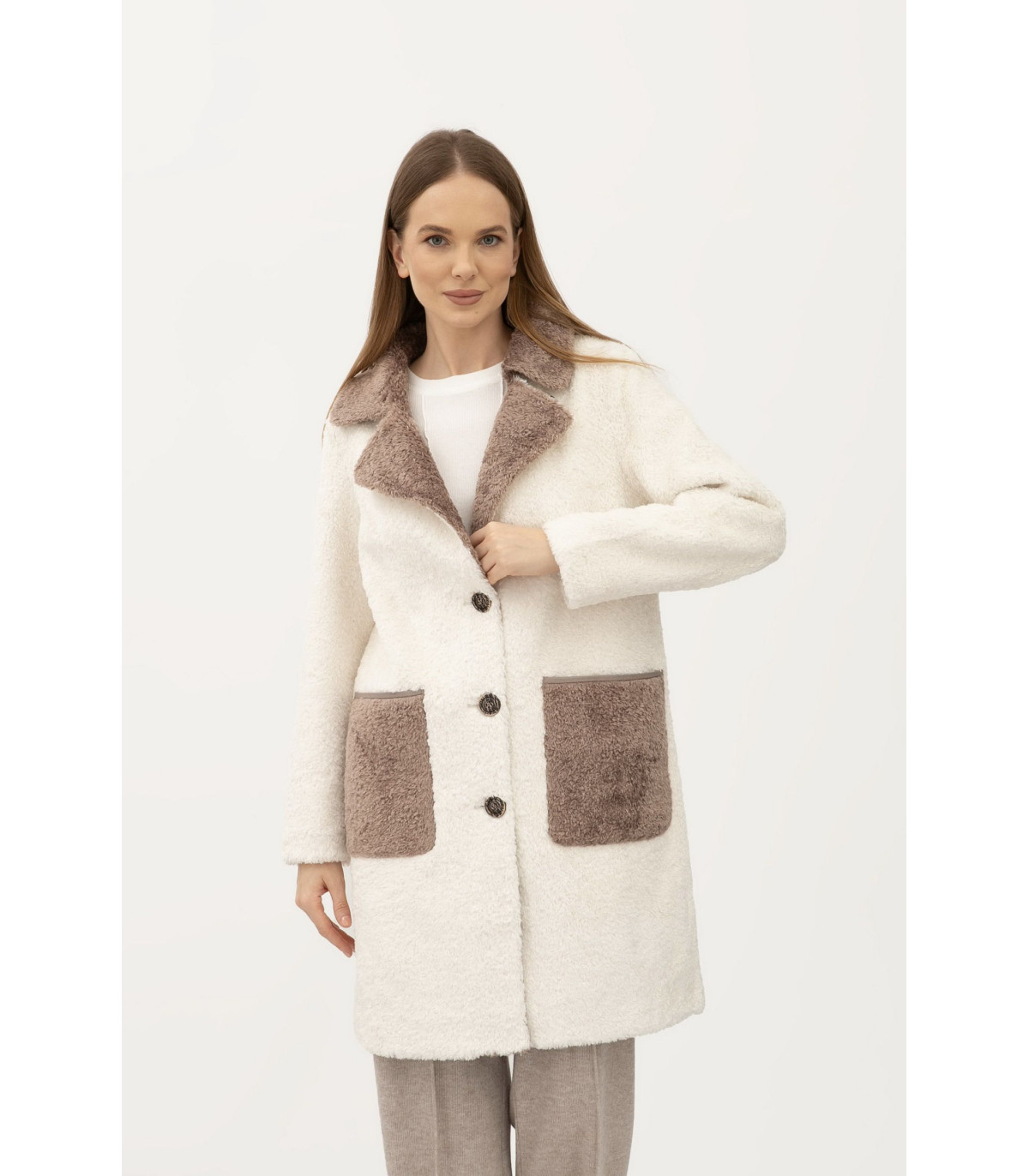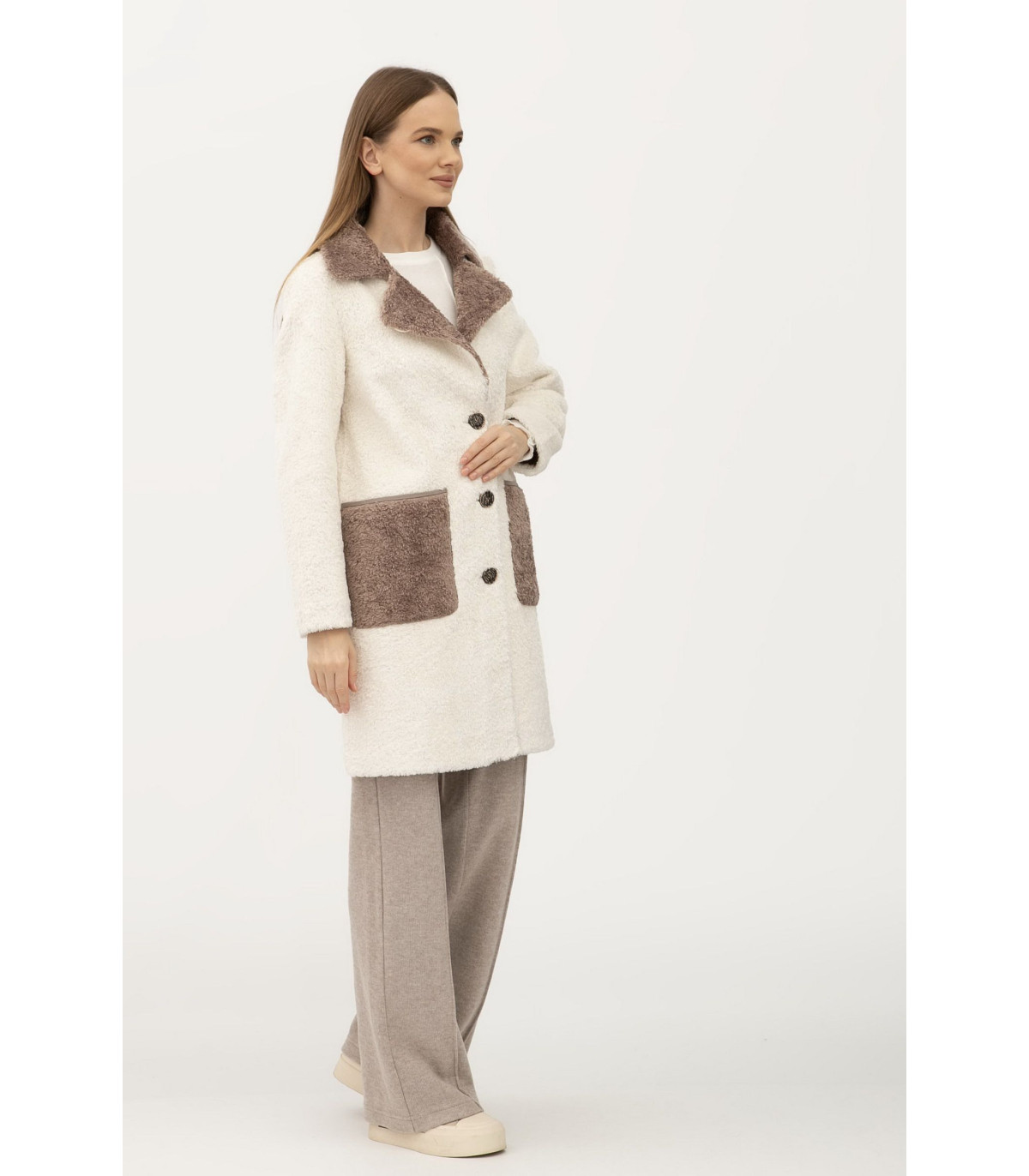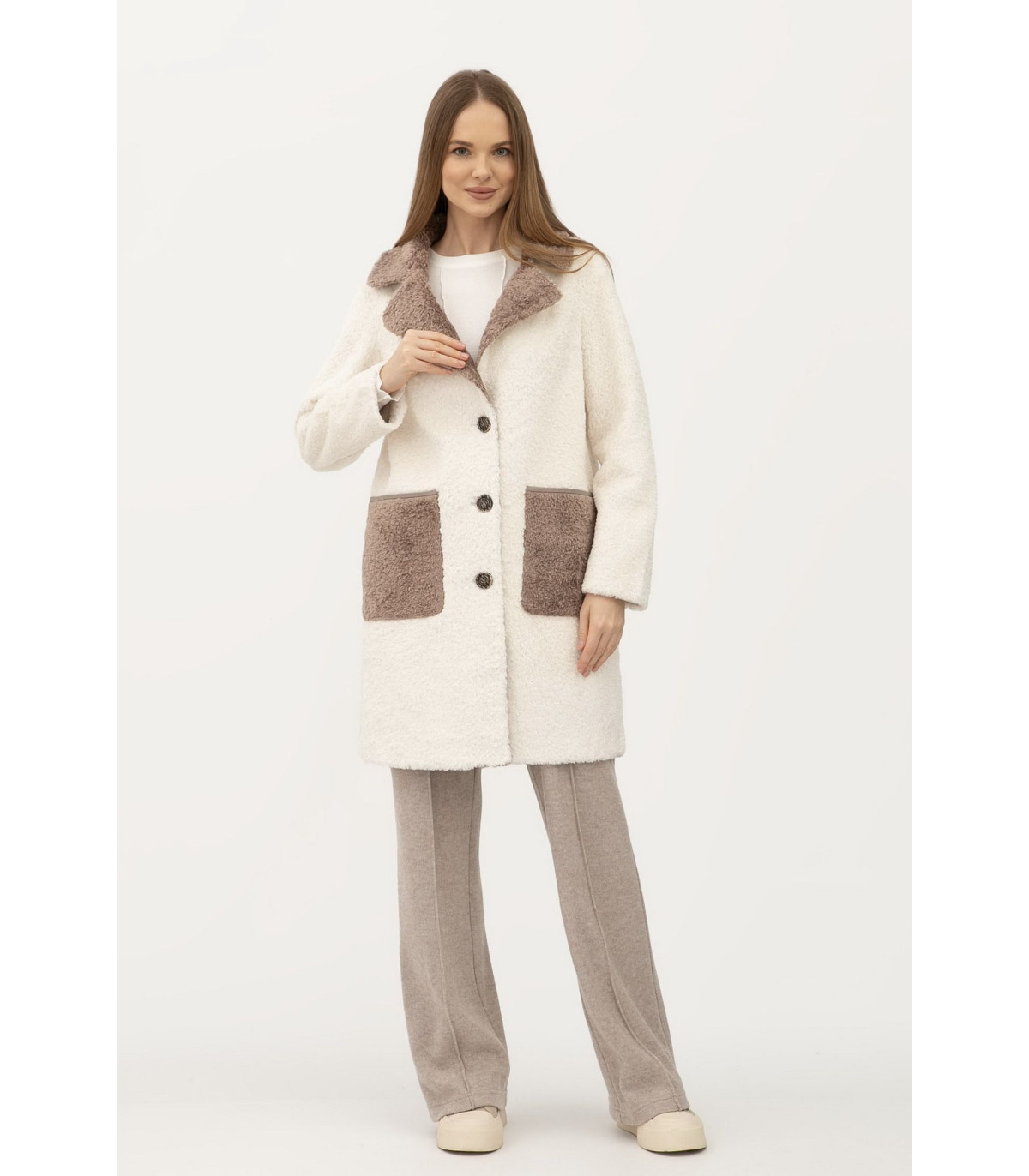 Длина чуть выше колена, воротник отложной. Застёгивается на пуговицы. Рукав длинный, втачный. С обеих сторон есть карманы, накладные. Двухстороннее пальто хорошо подходит как под одежду свободного кроя "oversize", так под классические образы. Прекрасно комбинируется как под классическую, так под спортивную обувь.