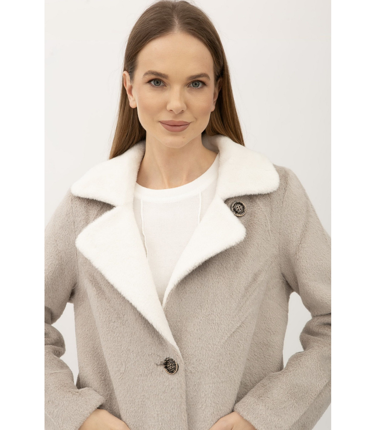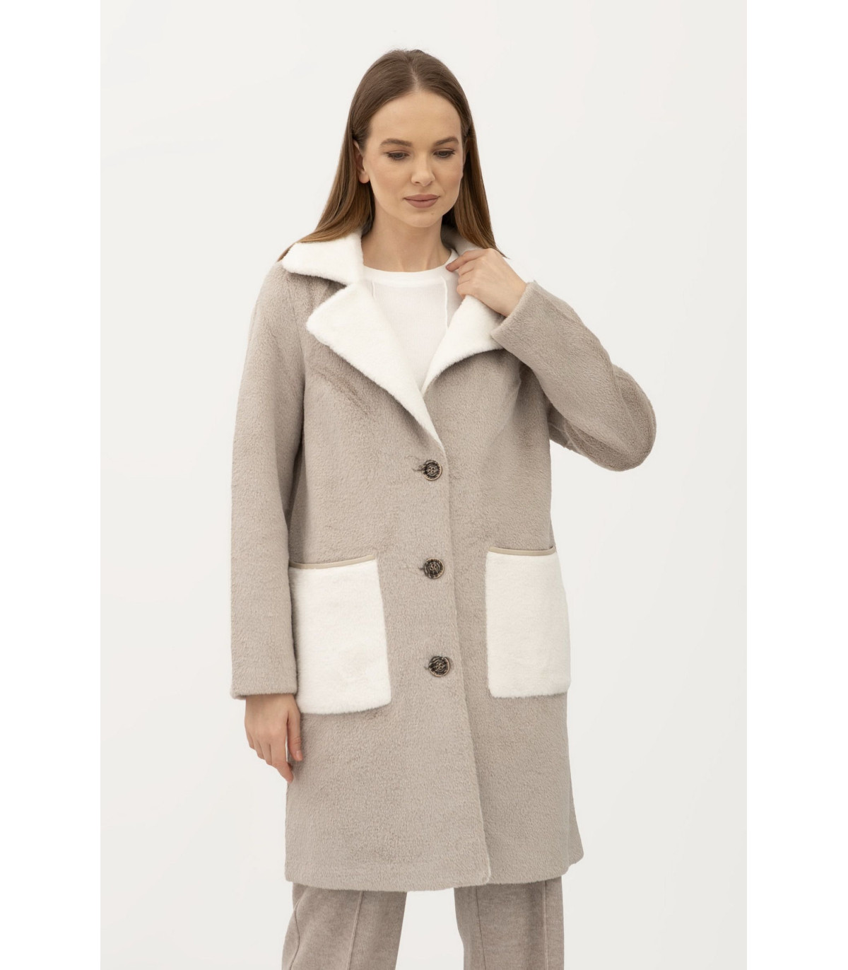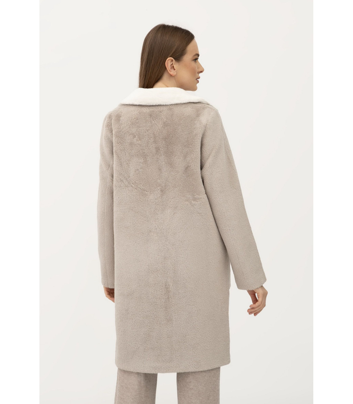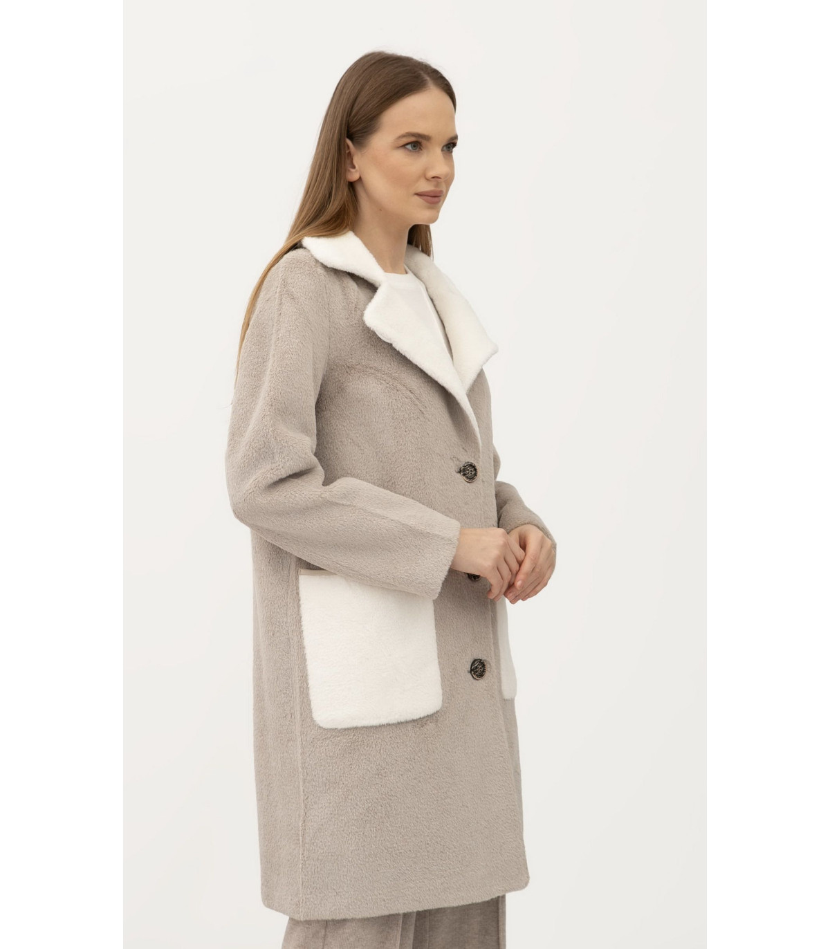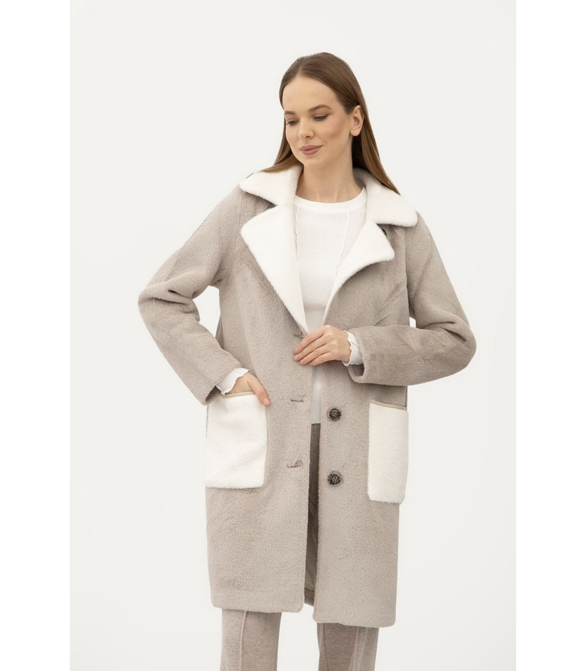 Длина чуть выше колена, воротник отложной. Застёгивается на пуговицы. Рукав длинный, втачный. С обеих сторон есть карманы, накладные. Двухстороннее пальто хорошо подходит как под одежду свободного кроя "oversize", так под классические образы. Прекрасно комбинируется как под классическую, так под спортивную обувь.